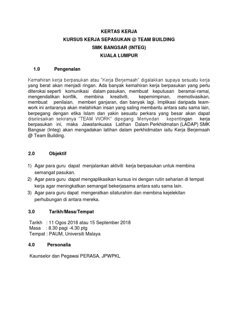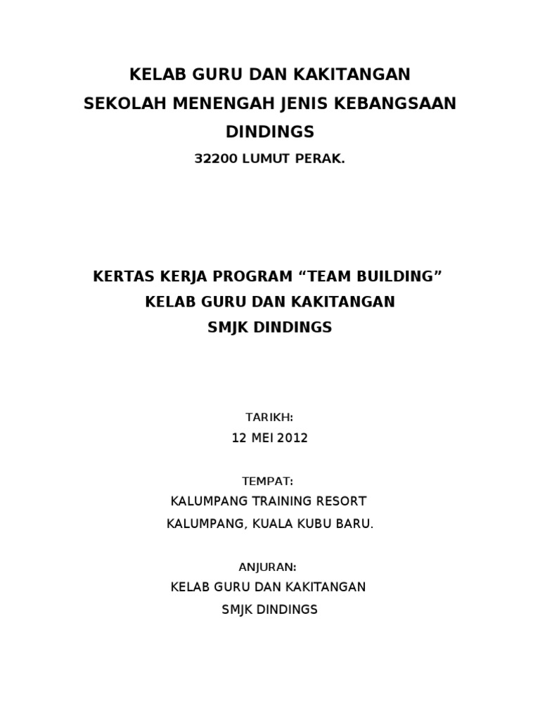 Kertas Cadangan Program Team Building 932019 Kertas Kerja Pembentangan Jabatan Kerja Raya Malaysia Hubungi Kami. KERTAS KERJA TEAM BUILDING SK PAYA KELADI ANJURAN. View kertas_kerja_team_buildingdoc from CS MISC at Open University Malaysia.